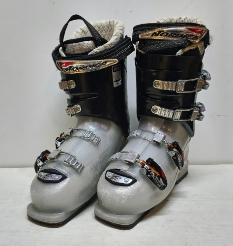 Použité lyžiarky Nordica Hot RDJ, veľkosť MP 25/25.5; dĺžka skeletu 298 mm. Používané, zachovalé, štvor-klipsňové lyžiarky, flex index: 65