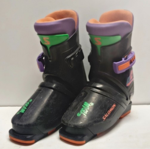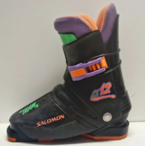 Použité lyžiarky Salomon SX 12 Team, veľkosť MP 22/22.5, dĺžka skeletu 268 mm. Staršia, používaná jednoklipsňová detská lyžiarka.