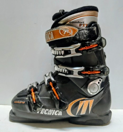 Použité lyžiarky Tecnica Entryx SP, veľkosť MP 25/25.5; dĺžka skeletu 294 mm. Používané štvor-klipsňové lyžiarky.