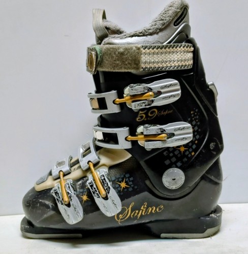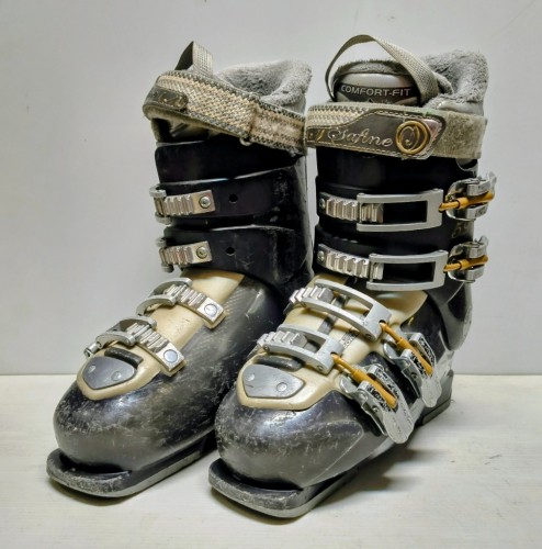 Použité lyžiarky Tecno Safine, veľkosť MP 24/24.5 = UK 5/5.5, dĺžka skeletu 285 mm. Staršie používané štvor klipsňové lyžiarky.